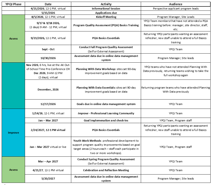 The purpose of the YPQI is to engage Alaska out-of-school-time programs in continuous quality improvement that increases participating youth’s access to positive development experiences, resulting in better youth outcomes.